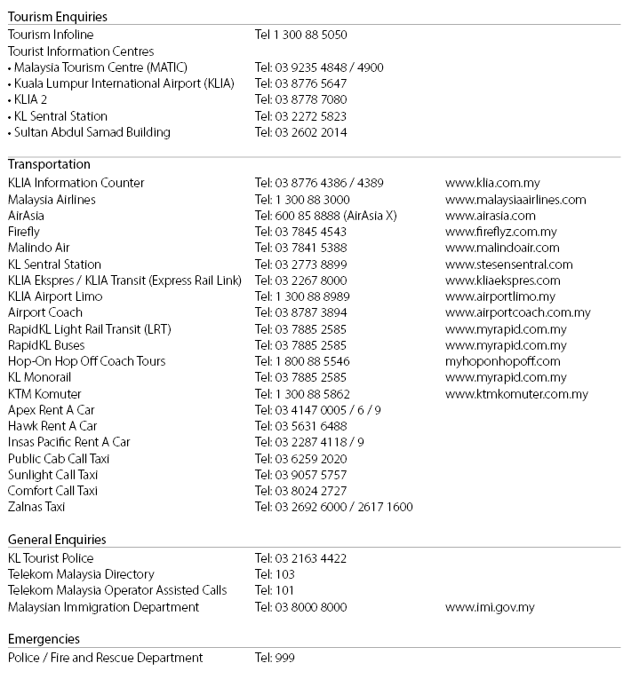 This section provides contact numbers that will be useful to visitors. Further information on KL can also be obtained from the following websites: