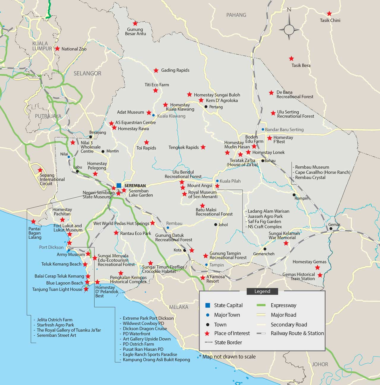 Kuala Lumpur is about 60 km from Seremban via the North-South Expressway. Port Dickson is located along the coastal road and is an hour’s drive from Seremban.